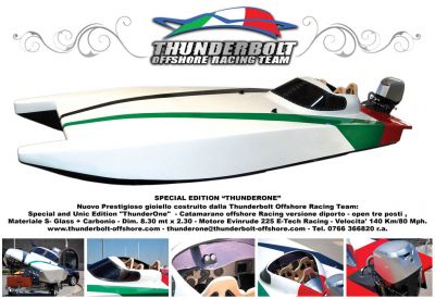 - Nuovo Prestigioso gioiello costruito dalla Thunderbolt Offshore Racing Team: Special & Unique Edition ThunderOne - Catamarano offshore Racing versione diporto - open tre posti. Materiale S-Glass + Carbonio - Dim. 8.30 x 2.30mt - Motore Evinrude 225 E-Tech Racing - Velocità 140Km/80 Mph. www.thunderbolt-offshore.com - thunderone@thunderbolt-offshore.com - Tel. +39 766 366820 r.a.