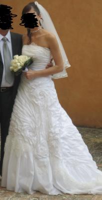 - Abito da sposa in meraviglioso taffetà color bianco (tg 44 modificabile). L'abito è intero, corpetto sostenuto e strascico medio per un’ottima vestibilità. La caratteristica unica è il gioco sartoriale delle rose create con la stoffa dell'abito stesso. Per una sposa semplice ma raffinata ed elegante. Compreso il velo corto e copri spalla per chiesa. Prezzo di acquisto 1.200€ (estate 2008). Già lavato e stirato, disponibile per prova. PREZZO 600€ scarpe bianche n.39 e velo compresi.