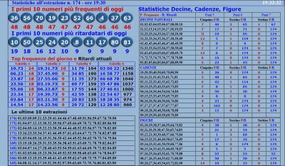 - Statistiche per estratti, coppie, terzine più frequenti e più ritardatarie giornaliere e storiche e anche per Decine, Cadenze e Figure per le sorti del 5, 6 e 7. VBincite giornaliere, spoglio giocate, Tabellone analitico. 1) Estrazione 10 e Lotto 5 minuti 2) I 5 e 10 estratti più frequenti e più ritardatari del giorno 3) Le coppie e le terzine più frequenti del giorno 4) Le coppie e le terzine con frequenze storiche e ritardi attuali 5) Frequenze e ritardi per il 5, 6, e 7 per Decine, Cadenze e Figure 6) Spoglio giocate 7) Tutti gli sfaldamenti giornalieri di coppie e terzine 8) Seleziona i tuoi numeri, specifica il punteggio e trova il ritardo 9) Tabellone Analitico 10) La previsione del momento 11) Win for Life