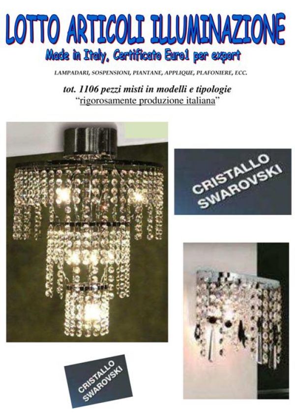 - Stock articoli di illuminazione: lampadari, sospensioni, piantane, applique, plafoniere, misti in modelli: cristallo Swarovski, vetro, ceramica, ecc. Tutto rigorosamente Made in Italy con Certificato Euro 1 per export Totale 1106 pezzi disposti in 8 bancali circa Per info su prezzo ed altro contattare: BOBBI LUCA 328 8535881 o 0744 800948
