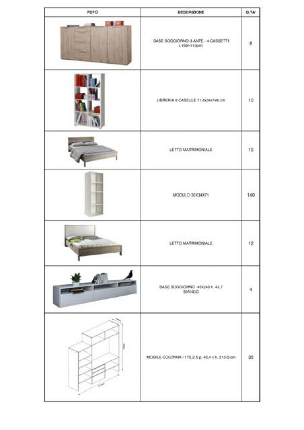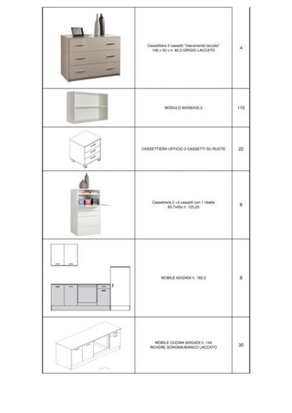 - Stock mobili in kit (EUR 1): basi soggiorno, librerie, letti matrimoniali, mobili a colonna, cassettiere, moduli, pensili e colonne da cucina e tanto altro. Totale articoli 684 pezzi. Per trattative su prezzo ed altre informazioni contattare il Sig. Bobbi Luca: 328. 8535881 o 0744. 800948