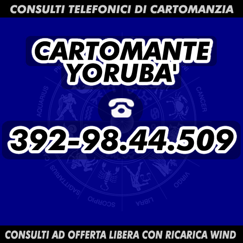 - ¸.•*´¨`*•.¸Studio Cartomanzia Yorubà¸.•*´¨`*•. Servizio di Cartomanzia a basso costo tutti i giorni dalle ore 9 alle ore 18 chiamando un normale numero di cellulare che potete visualizzare nella foto in allegato a questo annuncio. Vengono letti e interpretati i classici e tradizionali Tarocchi, le 22 carte degli Arcani Maggiori. A fronte di ogni singolo consulto svolto dal Cartomante Yoruba', della durata massima di 30 minuti, il consultante è pregato di lasciare un'offerta libera con una ricarica telefonica Wind oppure PostePay secondo quanto verrà comunicato in sede telefonica.