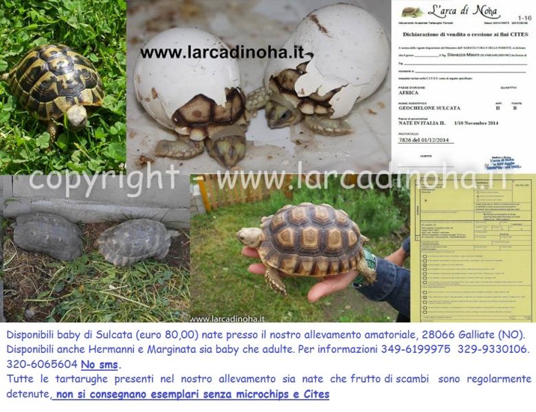 - Vendo (varie specie) tartarughe di terra, dispongo di magnifiche baby di Geochelone Sulcata nate presso la mia abitazione, genitori visibili, Cites (italiano). A sole Euro 80,00 cad. per ulteriori informazioni potete contattarmi al: tel. 320.6065604 No sms. Annuncio sempre valido.