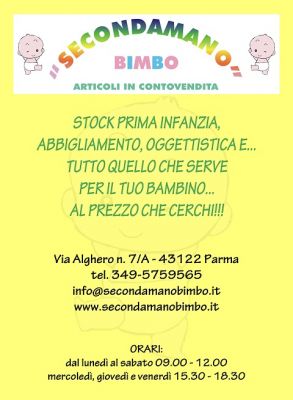 - La nascita di un Bimbo e' un dono bellissimo, tutti ci dicono... vedrai quanto costa....bene, oggi risparmiare senza farci mancare nulla di Utile o di Futile si puo': SECONDAMANOBIMBO Via Alghero 7 a Parma un negozio da 5 anni al servizio delle mamme, puoi trovare Nuovo o Usato ma tutto ad ottimi prezzi e selezionato!! E se il tuo bimbo e cresciuto e trio...passeggino...lettino o altro non ti servono piu' portamelo vendendolo tu realizzi qualcosa e a un'altra mamma possono servire!! x info tel: 349 5759565 o visita www.secondamanobimbo.it ORARI NEGOZIO: da Lunedi a Sabato 9-12 merc. Giov. e Venerdi anche 15,30-18,30
