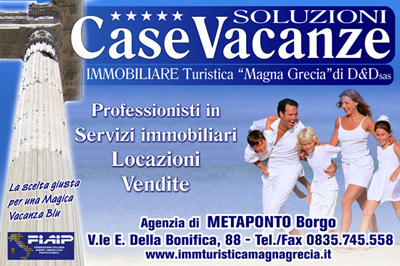 - VENDESI-Costa Jonica Lido di Metaponto - Immobili Turistici - CaseVacanze, che spaziano dai bilocali ai quadrilocali, accessori e doppi servizi, villette e mansarde di varie superficie e metrature. A Metaponto Lido / Borgo / Villaggi T. ed oltre. SERVIZIO CLIENTI INFO: TEL. 0835.745.558 - 0835.543.768 - www.immturisticamagnagrecia.it - immturistica@bernalda.net Associato FIAIP Premio Onestà e Cortesia 2009