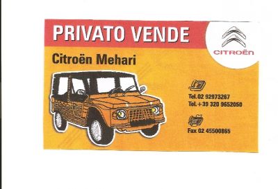 - VENDO CITROEN MEHARI COLORE ARANCIO DEL 1973 COMPLETAMENTE RIVERNICIATA A NUOVO DA SMONTATA CON SOSTITUZIONE DI GRAN PARTE DELLE PLASTICHE,GOMME,SELLERIA,CAPOTTA,BATTERIA,SERBATOIO,AMMORTIZZATORI,MARMITTA,IMPIANTO FRENANTE COMPLETO.PER QUALSIASI INFORMAZIONENON ESITATE A CHIAMARMI.CARLOS 3209652050