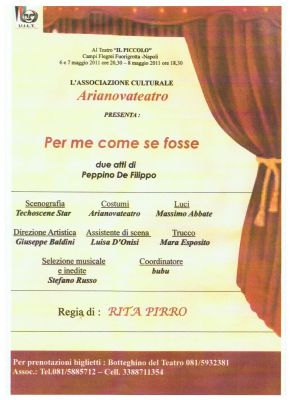 - Info: 338 8174426 - 347 5471219 (Antonio) -------------------------------------------------------------------------------------------------- Al Teatro “Il Piccolo” Campi Flegrei Fuorigrotta – Napoli 6 e 7 maggio 2011 ore 20,30 – 8 maggio 2011 ore 18,30 -------------------------------------------------------------------------------------------------- L'ASSOCIAZIONE CULTURALE Arianovateatro PRESENTA: Per me come se fosse Due atti e quattro quadri di Peppino De Filippo Personaggi ed interpreti in ordine di apparizione : GENNARINO Andrea Felo SERGIO Francesco Tisi MILLY DONATI Maria Falco CAMILLO bubu ANGELINA Ilaria Luongo MARGHERITA Lucia Altruda MILLY Marina Russo MATILDE Luisa D'Onisi EUSTORGIO CIPRIANI Marco Rossi MORESI Giuseppe Baldini DOMENICO Francesco Gallo DE LEO Salvatore Dolce PADRE BONELLI Vittorio Rispoli ------------------------------------------------------------------------------- Regia di : Rita Pirro Scenografia Costumi Luci Selezione musicale e inedite Technoscene Sta
