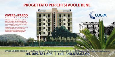 - Stai cercando la TUA NUOVA CASA ? Scegli VIVERE AL PARCO ! Ti offriamo diverse soluzioni abitative a partire da 63 mq e da 180.000 euro nel centro di Pontecagnano (Sa). Vivere al Parco, unisce il piacere di essere circondati dalla natura senza rinunciare al comfort dei servizi a portata di mano(banca, scuola, mezzi pubblici, negozi etc). Contattaci per maggiori informazioni e/o per vedere da vicino gli appartamenti Ufficio Vendite: via Mons. Grasso, 4 84098 Pontecagnano Faiano (SA) tel. 089.381.605 - cell. 340.878.62.69 email : vendite@cogimsrl.net e sito: www.viverealparco.net