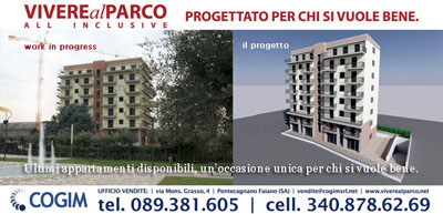 - Vendita appartamento Pontecagnano mq 63 VIVERE AL PARCO ..nuovissimi appartamenti in Pontecagnano (SA) zona centro Una casa in centro a Pontecagnano (Sa) immersa nel verde, al centro di tutti i servizi (scuola, posta, banca, municipio, centro commerciale, cinema, stazione ferroviaria) una casa esclusiva dove vivere : Complesso residenziale VIVERE AL PARCO, progettato per chi si vuole bene. OCCASIONE : APPARTAMENTO “NUOVO” a 160.000 Euro (All inclusive) !! Appartamento di nuova costruzione, all’interno di VIVERE AL PARCO, circa 63 mq, classe energetica A - IPE < 30 Kwh/mq annuo Ultimi appartamenti disponibili. Appartamenti a partire da 160.000. Società Costruttrice di VIVERE AL PARCO : Cogim srl - progettazione, costruzione e gestione immobili di qualità. www.cogimsrl.net | info@cogimsr